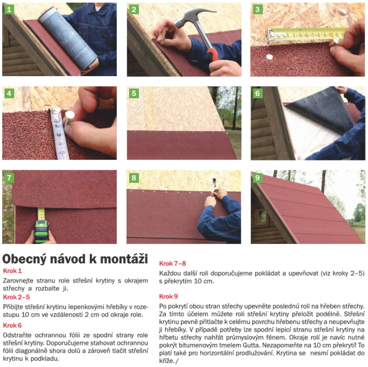 Instalace je velmi jednoduchá, bez použití plamene. Stačí pouze rozbalit, strhnout ochrannou folii a nalepit k podkladu. Doporučujeme kombinaci s kroucenými lepenkáči.